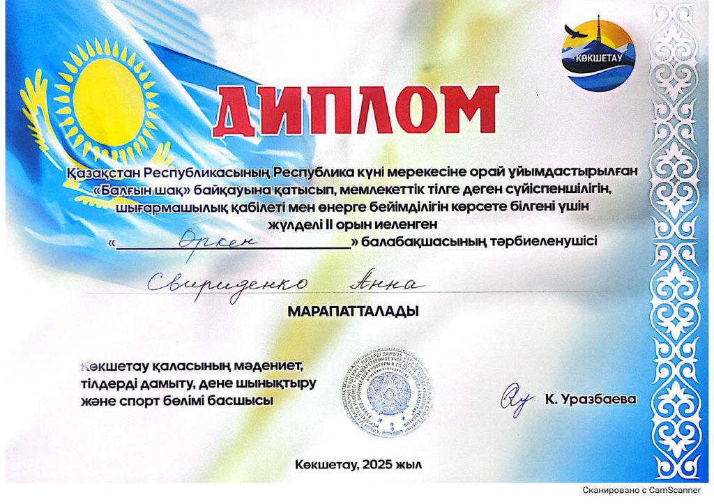 "Балғын шақ" байқауында "Өркен" бөбекжайының тәрбиеленушісі Свириденко Анна ІІ орынды жеңіп алып, дипломмен және естелік сыйлықпен марапатталды. Құттықтаймыз!!!
