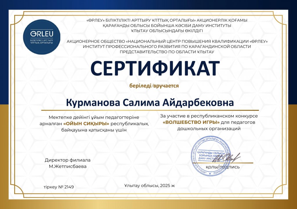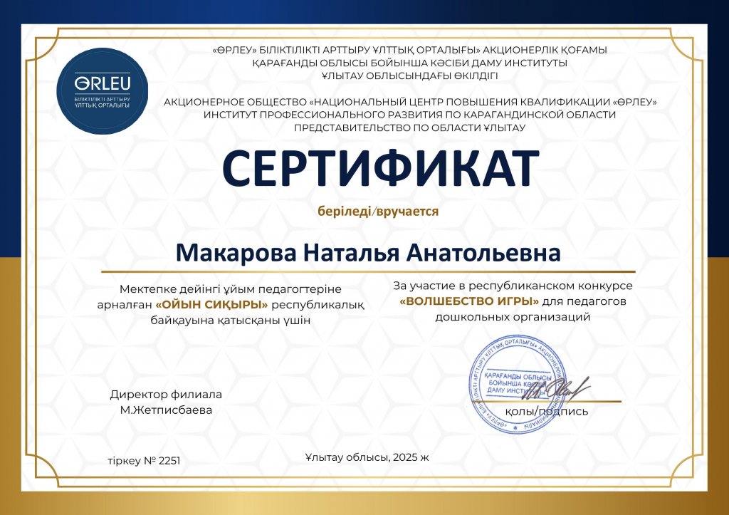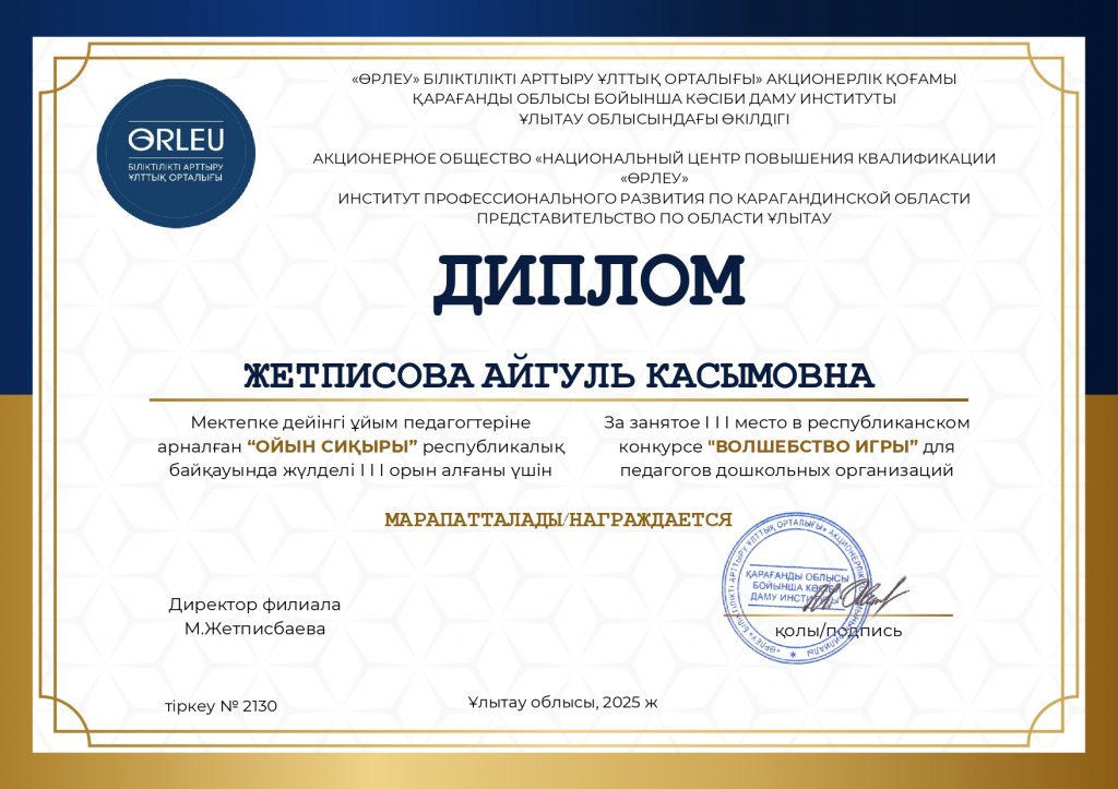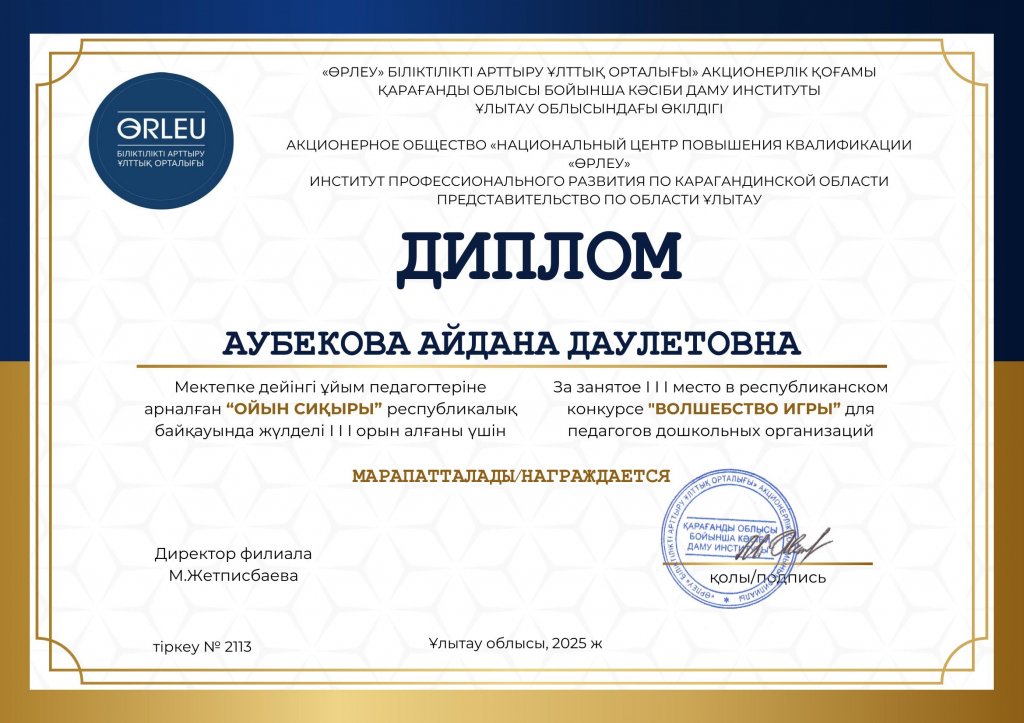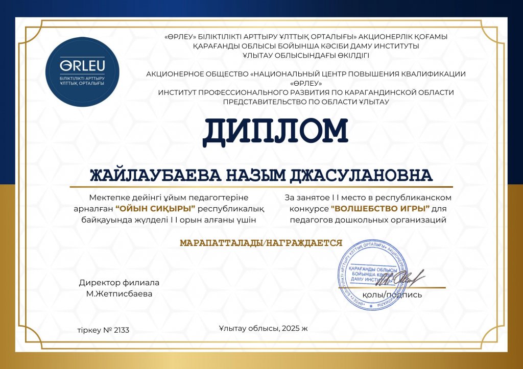 "Өрлеу" БАҰО "АҚ Қарағанды облысы бойынша КДИ Ұлытау облысындағы өкілдігі ұйымдастырған Республикалық "Ойын сиқыры" байқауында "Өркен" бөбекжайының педагогтары Темиргалиева Айнагуль Ерденовна І орын, Жайлаубаева Назым Жасулановна ІІ орын, Жетписова Айгуль Касымовна, Лавриненко Надежда Владимировна Аубекова Айдана Даулетовна ІІІ орын дипломдарымен марапатталды. Курманова С.А., Габбасова Г. К., Макарова Н.А., Кабильжапарова А.К., Житниковская Е.А. байқауға қатысқаны үшін сертификаттарға ие болды.
